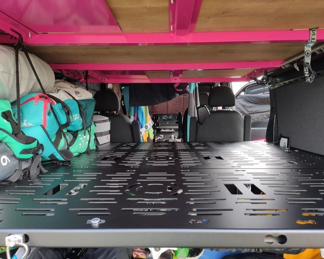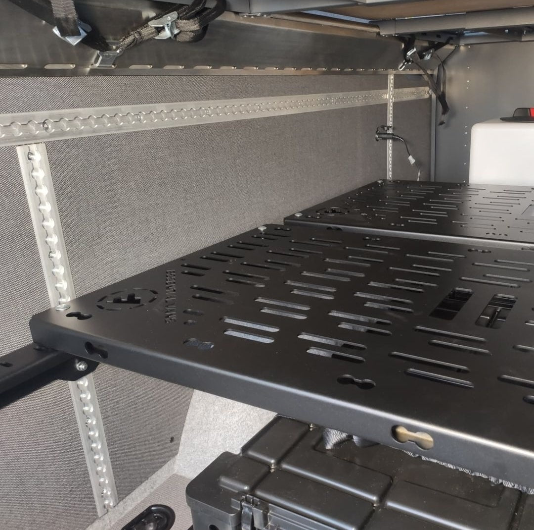 The Essential Vans EV-B56540 light weight, black powder coated aluminum cargo shelf can be used in in combination with 1,2 or 3 shelves to create a large cargo area or spare sleeping surface. Surface holes promote air circulation around cargo or mattress and special holes for L-channel tie downs ***NOTE: must be used in combination with EV-B56541 cargo space strips.***